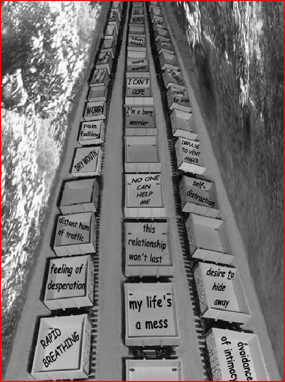 Imagen ii: observador que desde el puente ve pasar los trenes del pensamiento, sentimiento e impulso (idea de la ACT) . Cada uno de esos trenes lleva una colección de vagones que pasan uno detrás de otro por debajo del puente.
