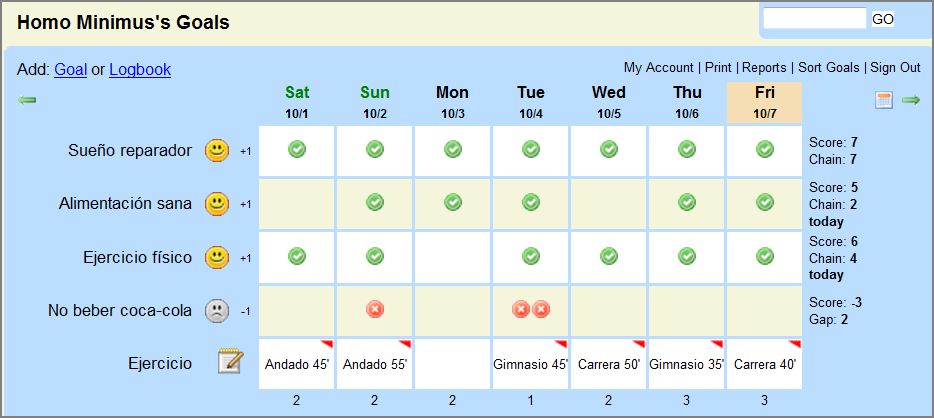 Joe’s Goals es una herramienta que  nos facilita el seguimiento de nuestras metas y compartir los resultados con amigos y familiares. El funcionamiento es sumamente sencillo: funciona en web, sin necesidad de bajar programas, sólo tienes que crear una cuenta. Obtienes una puntuación (“score”) en función del número de días que cumples el hábito. Además, te informa del número de días que has mantenido el hábito seguido (“chain” o cadena). Puedes añadir en la misma página un “log” o diario del hábito para detallar tu actividad o  añadir observaciones.  Como característica adicional, tienes la posibilidad de hacer seguimiento de vicios o hábitos negativos; por ejemplo, dejar de fumar. En este caso, la puntuación será negativa por cada incumplimiento y aparecerá una señal roja en vez de una verde.