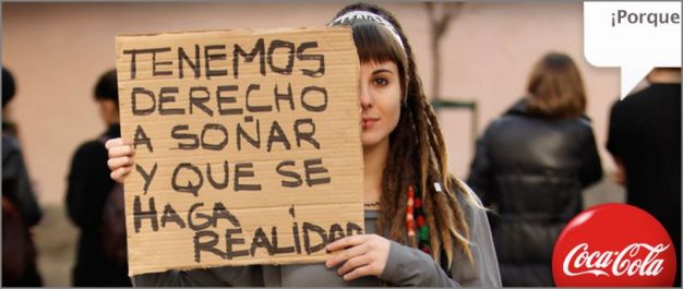4. No creo que un anuncio de Coca-cola tenga algo que ver con el movimiento 15M. El marketing fagocita cualquier cosa y la convierte en objeto de consumo. El anuncio pretende infantilizar a los manifestantes exigiendo un concepto vacío de contenido, soñar (quién puede estar en contra de soñar? ). Por otro lado soñar es mucho más cómodo para el poder que participar en la democracia.