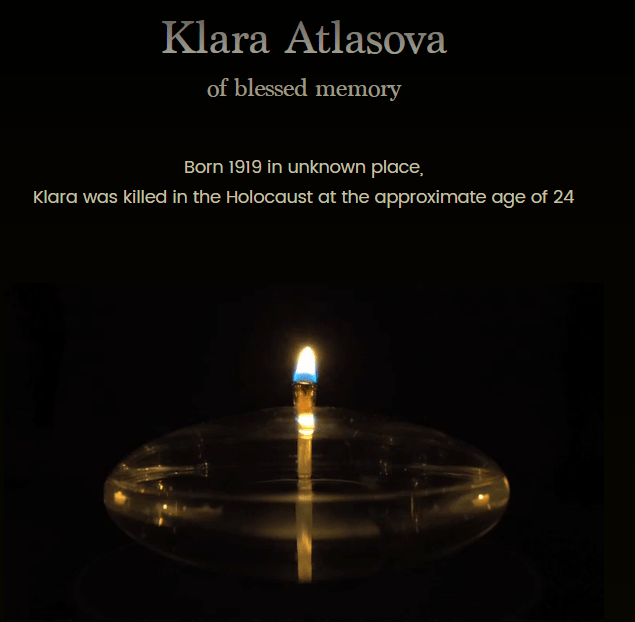 Klara Atlasova nació en 1919. Durante la guerra se encontraba en Zvolen, Checoslovaquia. Fue deportada en un transporte desde Žilina, Trenčín, Eslovaquia (Checoslovaquia) a Auschwitz, Polonia, el 17/04/1942.